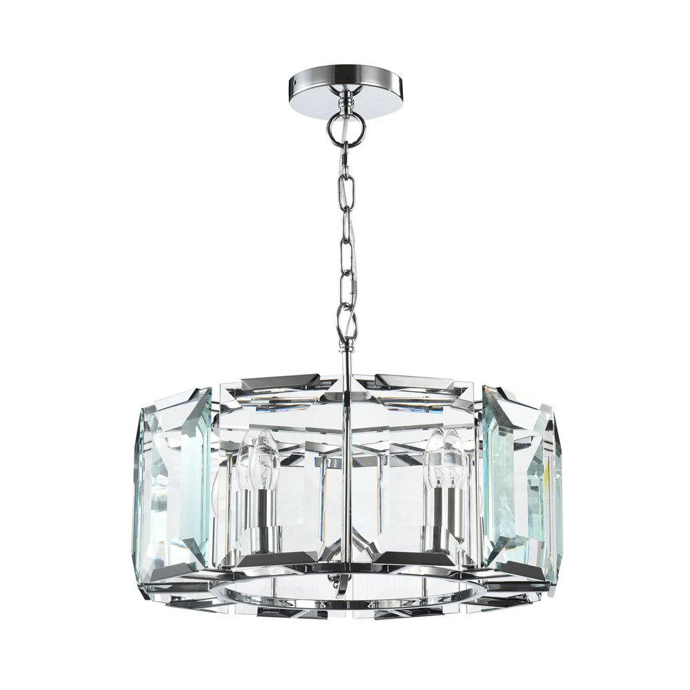Арматура из металла, цвет – хром. Плафон составляют пластины из прозрачного оптического стекла. Металлический каркас плафона окрашен в тон арматуре. Высота подвесных моделелей регулируется.