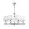 Хромированная металлическая арматура. Абажуры из белого текстиля, нанесенного на ПВХ. Стеклянный декор центральной части и розеток. Геометрические рожки.
