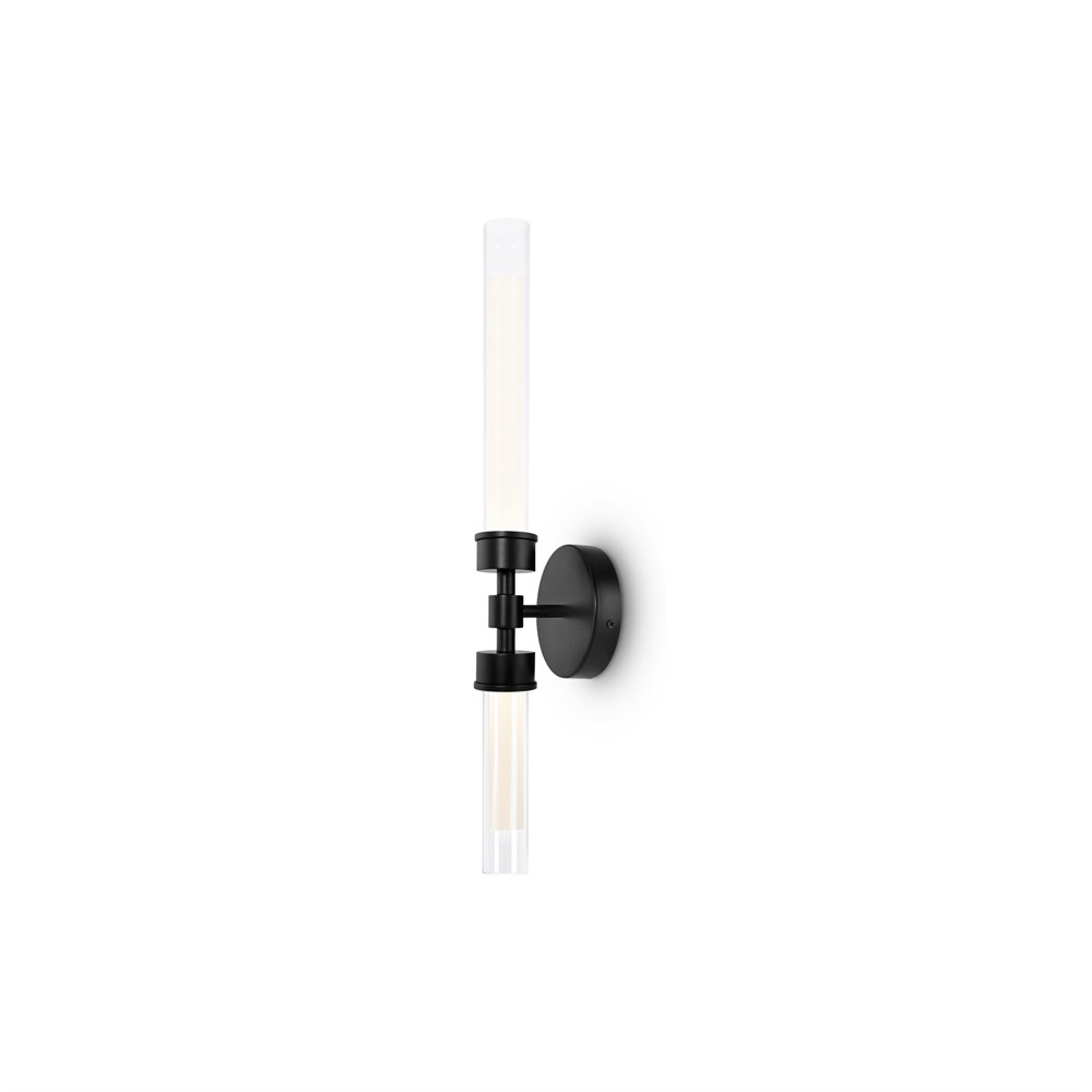 Арматура из металла в двух оттенках: черный и латунь. Плафон – прозрачная стек лянная трубка. LEDисточники света с цветовой температурой 3000К. Простые геометричные формы.