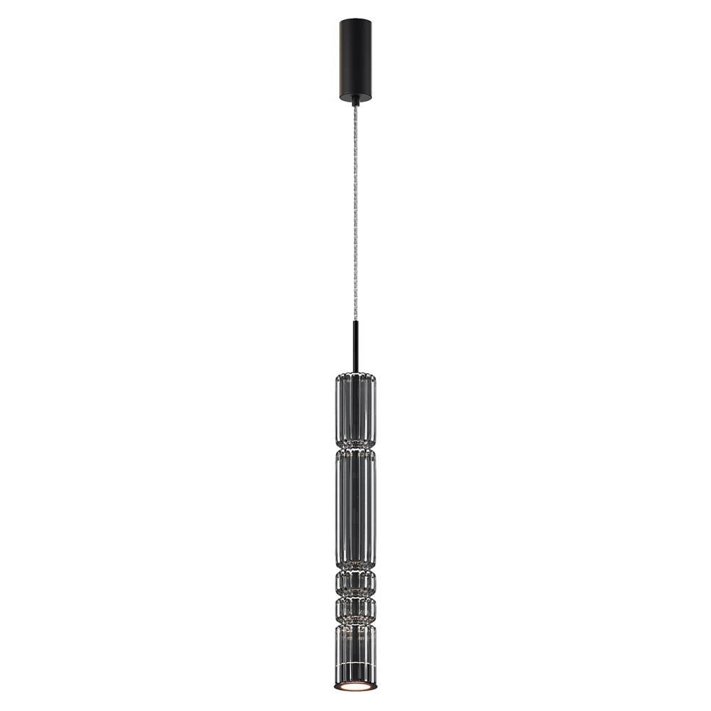 Арматура - металл, цвет - хром, латунь, черный. Цилиндрические плафоны из стекла с вертикальным рельефным рисунком в трех оттенках: прозрачный, коньячный, дымчатый. Метафора древнегреческих храмовых колонн в образе светильников. LED-источник света. Цветовая температура 3000К.